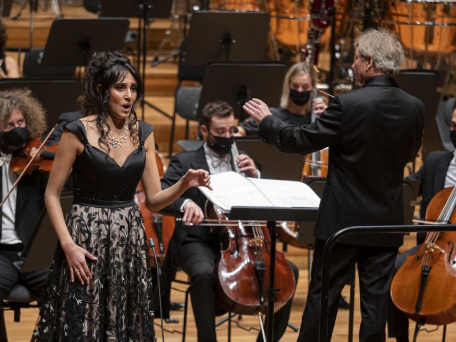 La mezzo Karina Demurova, que alcanzó un gran éxito, comenzó con «Haï Luli» y Canzonetta de concert, en las que desplegó variados recursos; con una cuidada afinación y unas medias voces sugerentes en la primera, y con especial sutileza, con ese diálogo con flauta y oboe, y un agudo expansivo en la segunda. En el resto de sus intervenciones, la voz no tuvo una proyección tan fluida ni una línea de canto igual, algo que se evidenció particularmente en el fraseo del registro central-grave en «Caña» y «Madrid». Con ser esto un obstáculo, no significó que no fueran interpretadas con aciertos. Demurova dejó el marchamo de una voz con esmalte y capacidad de expresarse con sentido poético. Fuera de programa, interpretó la famosa aria «Mon coeur s´ovre à ta voix», de Sansón y Dalila, ópera con la que la orquesta había comenzado el concierto, interpretando la Bacanal. Una versión trepidante en lo tímbrico y en sus imitaciones de las rítmicas orientales. Y si se captó la agitación de la fiesta, no pareció ocurrir lo mismo con los acentos más seductores.
