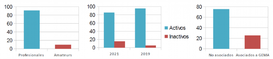 De esos 245 grupos, se auto-califican como amateurs únicamente el 9% de los mismos. Por otro lado, un 8% son grupos de nueva creación (entre 2020 y 2021), y se han mantenido sin actividad concertística durante 2021 el 15% del total de grupos frente al 5% que no la tuvo en 2019. Además, son asociados a GEMA (Asociación de Grupos Españoles de Música Antigua, la más conocida asociación del ramo) tan sólo el 25% del total de grupos españoles de música antigua, el resto de grupos permanecen sin asociar bajo ninguna sigla, o pertenecen a otras conocidas asociaciones de interpretes y ejecutantes de carácter más generalista.