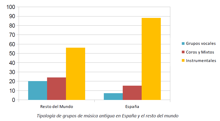 En España los datos son muy diferentes, pues frente al 78% de grupos instrumentales y orquestas de todo el conjunto de grupos de música antigua, el resto se reparte entre un 7% para los grupos vocales y un 15% de coros (la mayoría de ellos con carácter amateur) y agrupaciones mixtas (muy escasas en nuestro país). Esta preponderancia de lo camerístico e instrumental no es algo nuevo o desconocido en nuestro país, pues tradicionalmente se ha otorgado un papel inferior, incluso con cierto tratamiento despectivo tildado de «amateurismo», a quienes interpretaban en conjunto diferentes formas vocales del Medievo, Renacimiento o el Barroco, confrontados al canto lírico solista que ha sido casi objeto único y fin último de la formación vocal en nuestros conservatorios hasta hace bien poco. De hecho, son escasos los grupos vocales y coros profesionales que han adornado nuestra historia musical, y menos aún si centraron su repertorio en la música anterior a 1750.