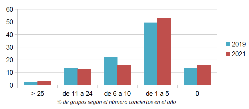 De aquí puede inferirse que en 2021 se ha producido un aumento significativo en el porcentaje de grupos que han ofrecido menos conciertos, o que incluso no han podido dar ninguno, frente a aquellos que han ofrecido un mayor número de conciertos puesto que han mantenido un porcentaje similar al de 2019. Todo ello, se produce sobre todo a costa de la franja de grupos con un número de conciertos medio (de 6 a 10), que es la que ha visto la mayor reducción en el número de grupos que la conforman.