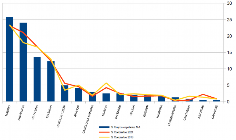 Por último, se han agrupado los datos de los conciertos ofrecidos por los grupos en base a su Comunidad Autónoma de origen durante 2019 y 2021, confrontándolos con el número de grupos pertenecientes a esas CC.AA. Podría esperarse un porcentaje similar de conciertos ofrecidos por grupos de una región determinada, al porcentaje de grupos música antigua que pertenecen a esa región, de hecho sus curvas de datos son similares, pero existen pequeñas y no tan pequeñas desviaciones que muestran como los grupos de algunas CC.AA. parecen estar obteniendo mejores resultados que otros en cuanto al número de conciertos que terminan desarrollando. Eso puede ser debido a muchos factores, pero sobre todo se podría achacar a las diferentes políticas de apoyo local o regional a la producción cultural propia de una región o comunidad, como por ejemplo al favorecer la presencia de grupos locales en los festivales y ciclos organizados con dinero público de la región imponiendo un porcentaje mínimo de presencia de los grupos locales, o mediante políticas de apoyo económico directo a la producción y las giras de los grupos de esa región, etc. Lo podemos observar en el siguiente gráfico: