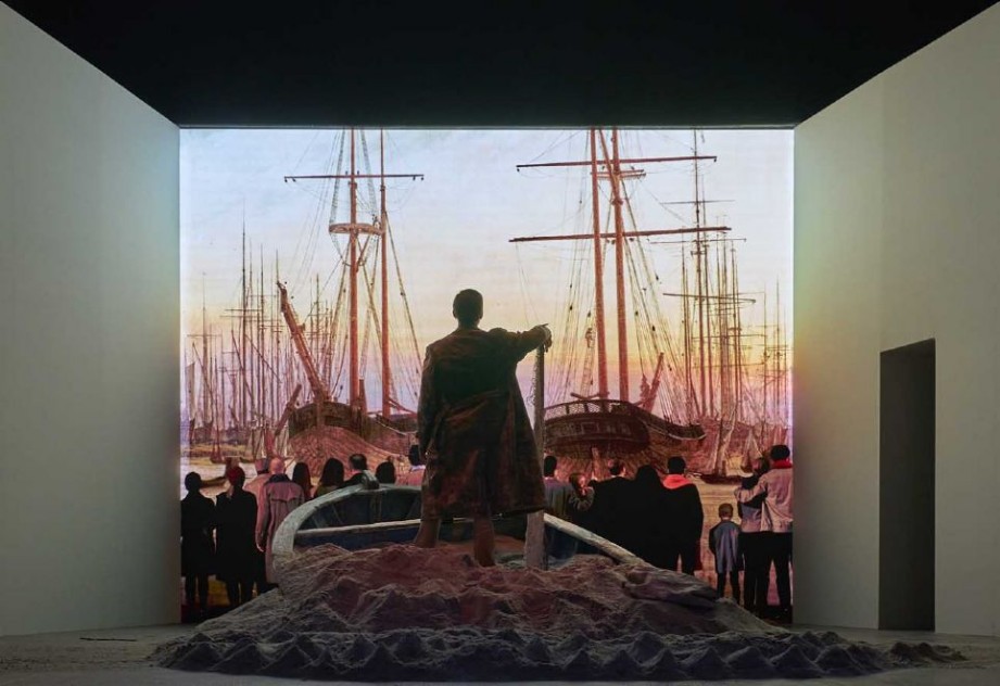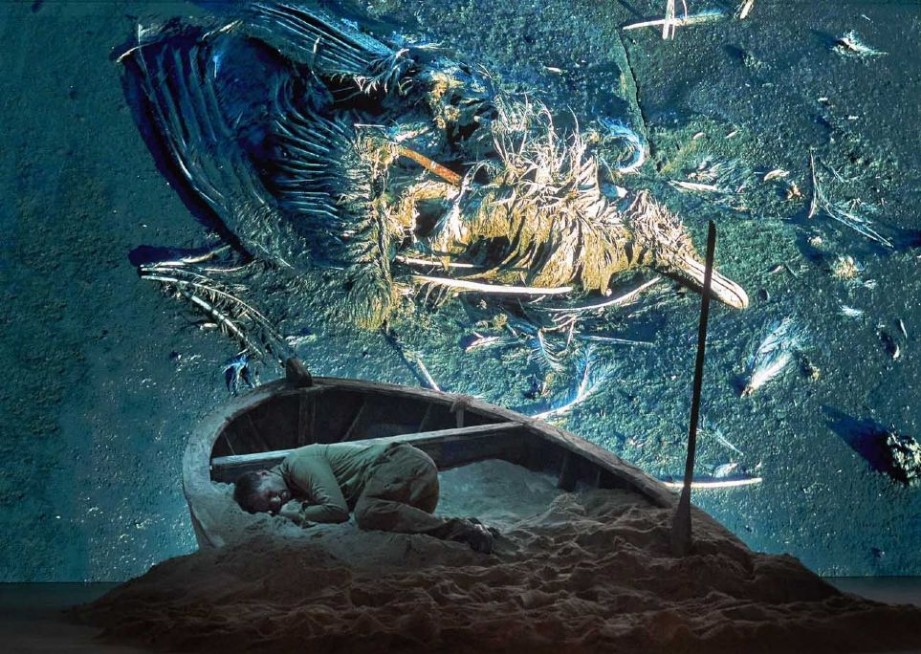 Su concepción es excepcional. Llevamos muchos años sufriendo producciones oscuras, feas, donde solo se busca la parte más tenebrosa y lóbrega de la sociedad. Haneke por el contrario, nos congracia con la vida. Utiliza todo el fondo del escenario como una pantalla de cine, ahora gigante, ahora pequeña en función de donde fije la trama, donde desgrana imágenes bellísimas. En el centro del escenario están inamovibles los restos de la proa del barco hundidos en la arena de la playa. En los laterales varios muebles caseros que sirven igual para la casa de Arden como para el molino de Klas. Las imágenes hacen de amalgama. Su denominador común es una luz y una belleza incomparables. La navegación por el mar, amaneceres y puestas de sol de quitar el hipo, un puerto lleno de veleros donde vemos como Arden va en el bote camino de su barco. Si sorprenden los exteriores, no se quedan atrás los interiores, con grandes imágenes que se reducen al tamaño de cuadros. En uno parece que estamos viendo un Vermeer en la pared del molino.