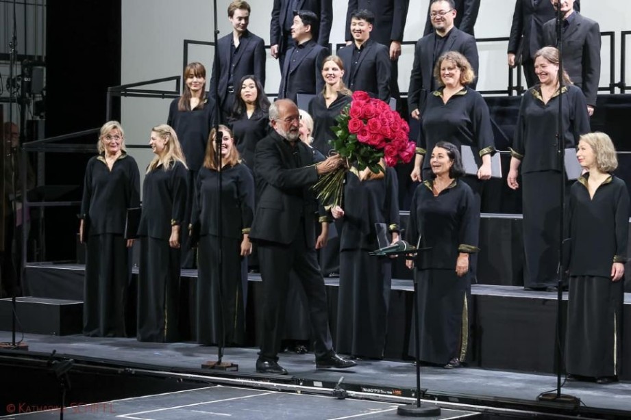 Con el público aplaudiendo a raudales, Stefan Herheim, el nuevo intendente del Theater an der Wien salió al escenario con un enorme ramo de rosas rojas para el Sr. Ortner, y con su felicitación pública micrófono en mano, dio a entender que la asociación entre el teatro y el coro se mantendrá en años venideros. Tras ello, el Sr. Ortner invitó a subir al escenario a muchos exmiembros del coro, para todos juntos terminar de nuevo con la música de Arnold Schonberg. En este caso, su temprana obra «Friede auf Erden» [Paz en la Tierra], Op. 13, compuesta en 1907 para coro mixto a cappella con texto de Conrad Ferdinand Meyer.