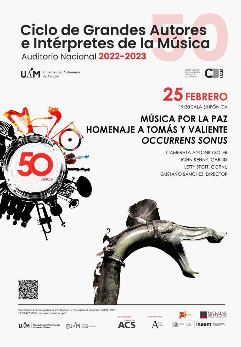 Bajo el título de Occurrens Sonus, llega al Auditorio Nacional de Música de Madrid el cuarto concierto del Ciclo de Grandes Autores e Intérpretes de la Música organizado por el Centro Superior de Investigación y Promoción de la Música [CSIPM] de la Universidad Autónoma de Madrid (UAM). Se trata de su anual concierto Música por la Paz en homenaje al profesor Francisco Tomas y Valiente, asesinado por ETA en su despacho de la UAM el 14 de febrero de 1996. Para esta ocasión la Camerata Antonio Soler, con dirección de Gustavo Sánchez, ofrece un singular programa consistente en la combinación de dos instrumentos con más de dos mil años de antigüedad procedentes del mundo celta y romano con los de una orquesta clásica. El programa girará en torno a los sonidos de esos instrumentos perdidos en el tiempo que dejaron de utilizarse hace más de un milenio: el carnyx celta y el cornu romano, y contará con el estreno absoluto de Echoes of the Ancients, un doble concierto para carnyx y cornu del galardonado compositor Lior Rosner.