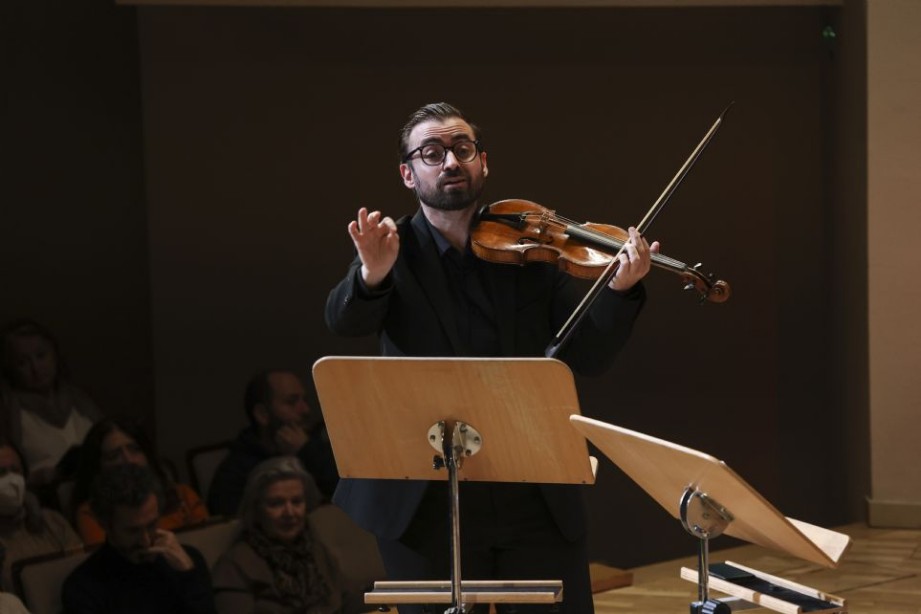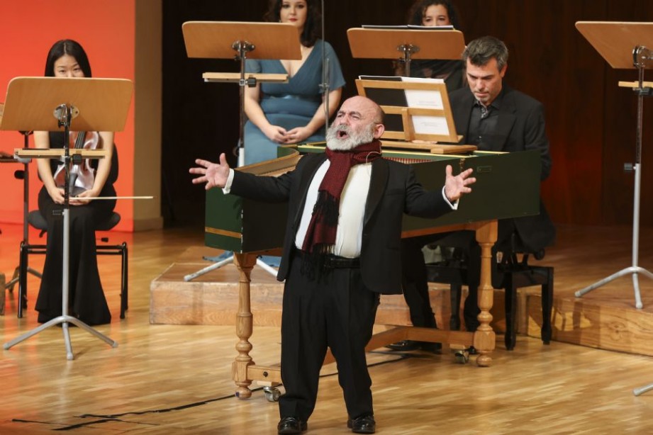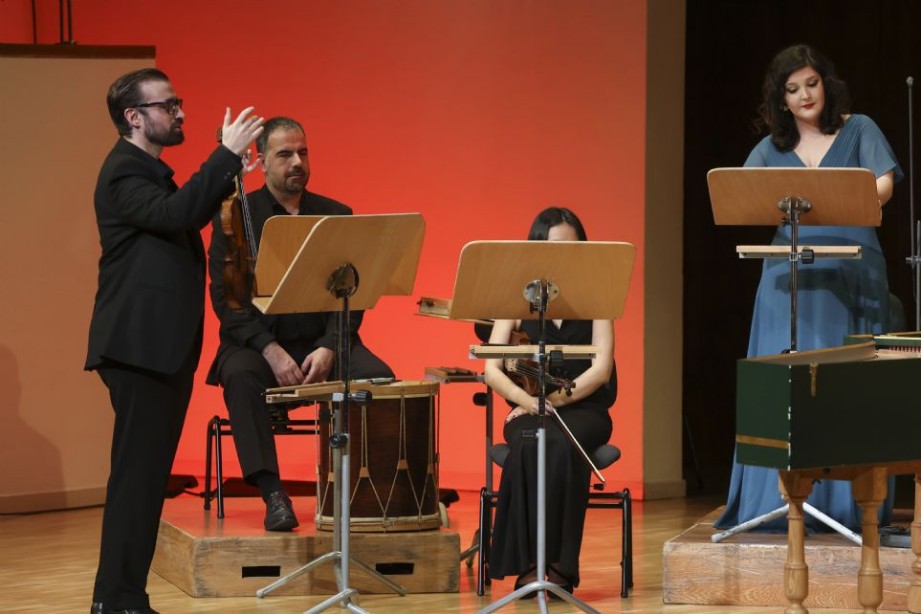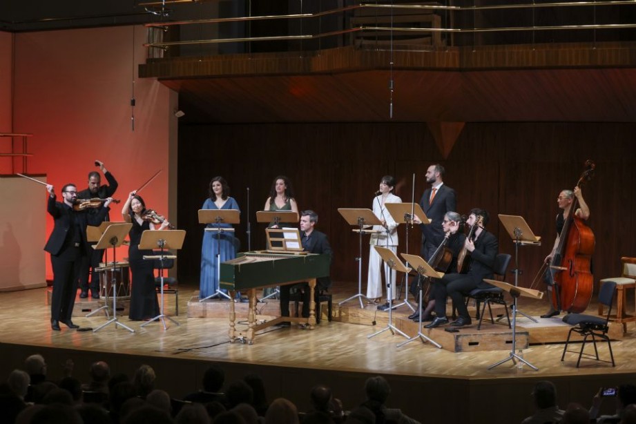 Concerto 1700 acudió en formato mínimo, con dos violines barrocos –el propio Pinteño acompañado de Fumiko Morie, su nueva compañera de aventuras violinísticas, con la que guarda una especial conexión– y un continuo conformado por Ruth Verona [violonchelo barroco] y Silvia Jiménez [contrabajo] en la cuerda grave, junto a Pablo Zapico a la guitarra barroca y Alfonso Sebastián en el clave. Completó la plantilla la atinada percusión de Pere Olivé. Desde la añadida Batalla del 5.º tono, utilizada aquí a la manera de una introducción instrumental, se observó un correcto desarrollo del sonido orquestal, aunque en su mínima expresión, si bien la presencia de solo dos violines se quedó algo corta en ciertos momentos –haberlos doblado, con cuatro en total, le hubiera dado un mayor brillo a las partes, aunque cabe destacar al buen trabajo de estos al elaborar el unísono de sus líneas–. Quizá algo más de trabajo –un problema recurrente en este tipo de obras– faltó en los cuatros de la obra [«No hay otras iras que deban temerse», «Pues que Polifemo todo lo avasalla» o «Al aire de los suspiros», por citar algunos], números de poderosa carga coral, aunque con llamativos solos, estos últimos sí bien representados; no así los pasajes más homofónicos a coro, con una excesiva independencia de las voces y algunos problemas de afinación causados por no equilibrar las voces –algunas, como la de Peña, llegaron con excesiva presencia, otras, como el barítono Cruz, con escaso impacto general– y no escucharse mucho entre ellos. Sin duda primó aquí más una visión solística que grupal, con lo que eso conlleva. Sí hubo cierto trabajo de dinámicas en varios de los cuatros [«Estos dulces cánticos», especialmente, o «Al aire de los suspiros»], lo que ayudó a clarificar un cierta forma un texto que, por otro lado, apenas se entendía –la dicción tampoco mejoró de forma general en los momentos a solo de ninguno de los cuatro solistas, aunque con algunas excepciones en ciertos momentos–. En «Númenes del mar sagrado», una mayor contención vocal logró un tutti mejor elaborado, cerrando la obra «¡Viva quien hace siglos de dichas sus años!», de luminoso sonido y un gran empaque del tutti, destacando el excelente resultado obtenido de la alternancia entre violines y coro.