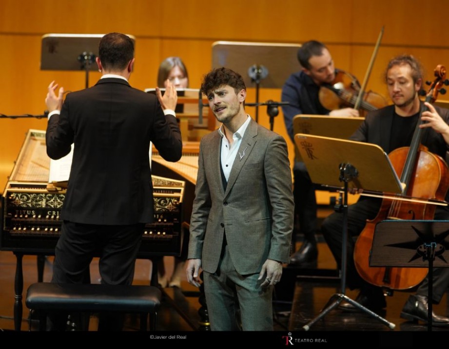 Pero analicemos los porqués de esta argumentación, en base a la actuación del contratenor aquí. Su vocalidad sigue tan «viciada» en muchos aspectos como la primera que lo escuché allá por inicios de 2021, con las mismas carencias técnicas, una tensión mandibular y facial notable a la hora de emitir –especialmente en las zonas más incómodas– y con una paleta de recursos canoros y expresivos tan manidos como predecibles a estas alturas. El forzamiento vocal se dejó notar ya desde el inicio, en el primero de los recitativos [«Numi, pietà!»] y en el aria inicial de su rol [«Cielo ingiusto»], con una coloratura poco natural, tirando a cierta mecanicismo, en la que pierde toda personalidad vocal, con tendencia a engolar en cierto rango de notas, incluso con notables desajustes en la afinación, una evidente desconexión entre registros y un agudo no especialmente limpio en emisión, aunque si con una proyección suficiente para llegar a todos los rincones del Teatro Real. A pesar de una sección de cuerda no especialmente nutrida para la ocasión [5/4/2/2/1], pero absolutamente solvente y espléndidamente trabajada –sigo diciendo que el poso dejado en las cuerdas por el violinista Riccardo Minasi, cofundador y titular de la agrupación años atrás, es uno de los mayores legados de esta agrupación–, el contratenor polaco no logró impregnarse de la soltura y finura de sus colegas, firmando un rol con escaso interés. En «Tiranni miei pensieri» acudió al habitual efectismo de tumbarse en escena, que ya por manido pierde todo efecto –lo repetirá más adelante, en una escena no especialmente verosímil a nivel dramático–. «Torna sol per un momento» es una aria de enorme hermosura, que sin embargo Orliński convirtió en innecesariamente afectada, aunque estuvo acompañado con enorme inteligencia por IlPDO, con una soberbia flexibilidad en el fraseo. Otro habitual recurso del polaco aquí: una nota tenida a solo, que hace crecer para lograr un impacto que ya no es tal. Sí hay que reconocerle una buena elección y ejecución de las ornamentaciones en el da capo. En «Se un solo è quel core» estuvo más contenido, y es sin duda un rol mucho más interesante para su vocalidad y para el resultado contenido, aunque la inconsistencia de su registro grave y el antinatural obscurecimiento de la voz no favorecieron una óptima escucha. En la habitual aria con referencias marinas [«Son qual rocca»] nuevamente la voz no corrió con naturalidad, y aunque hay que admitir que posee un timbre muy reconocible, lo cierto es que este no es, en muchos momentos, especialmente bello. El agudo, artificioso y sin interés, fue recompensado por una interpretación impecablemente expresiva en la orquesta, con una articulación de los acentos de gran impacto dramático, pues en la voz, cuanto mayor peso dramático, menor interés canoro, lo que es sin duda un problema. El poderoso staccato orquestal en «Stille amare» equilibró la ausencia de rendimiento en un registro grave vocal sin brillo ni personalidad, aunque en el fraseo legato mostró por fin algo de musicalidad bien entendida. Acudió una vez más al recurso de tumbarse, aquí dramáticamente con un sentido, aunque resultó sobreactuado.
