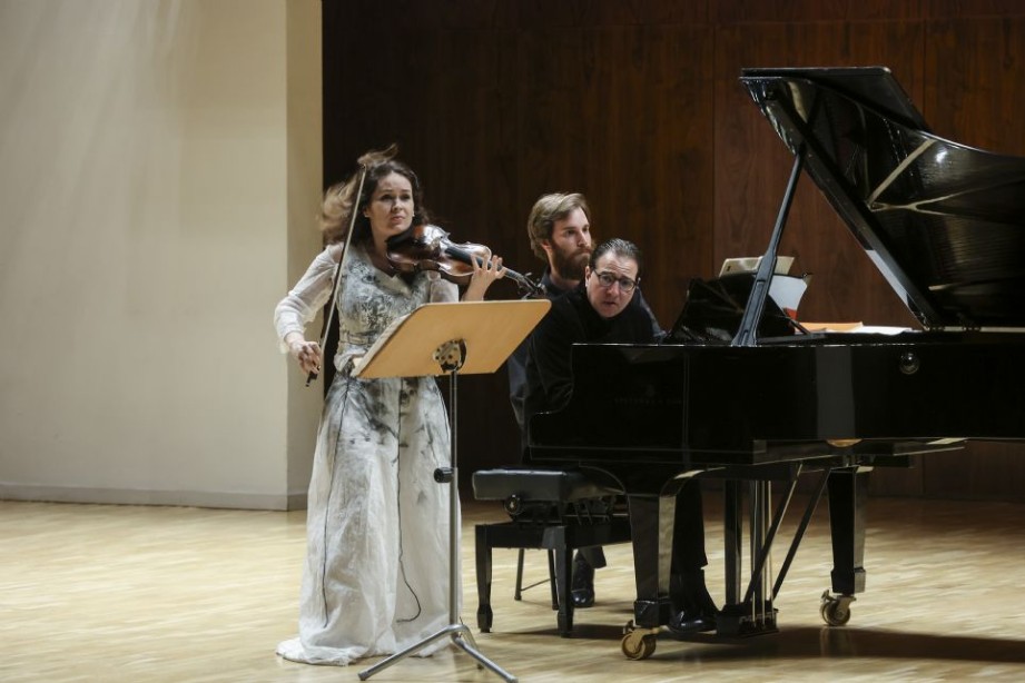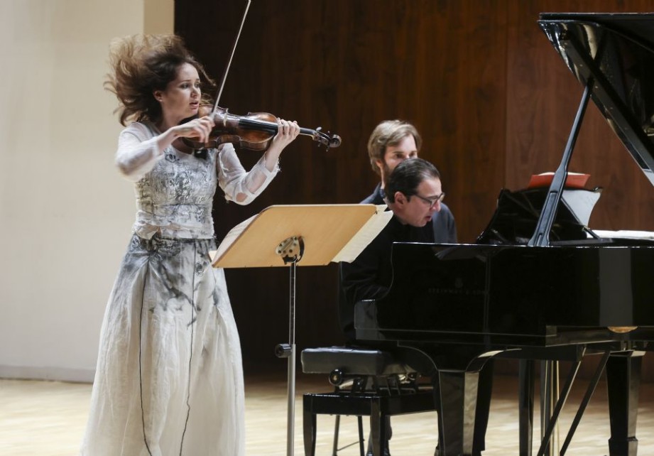 La obra, efectivamente, es generosa en dificultades, empezando por una escritura que no favorece la compenetración de violín y piano, que parecen, en muchos momentos, ir por diferentes caminos. A ello hay que sumar que, si bien la partitura exige un sonido percusivo, Fazil Say –indudablemente enérgico y temperamental– no calibró adecuadamente ni la sala reducida en que se encontraba, ni el balance con la violinista, por lo que, además de no producirse el necesario empaste en diversos pasajes, el exceso de aparato sonoro por parte del pianista se tornó un tanto violento e incluso ingrato para el oyente. Desde el allegro apassionato inicial, la Kopatchinskaja, con su técnica apabullante, abordó las múltiples dificultades que la obra exige al violín, dobles cuerdas, cambios de registro, saltos a la cuerda grave, complicados y veloces pizzicati, por no hablar de los más variados ataques y golpes de arco en plena pugna con el piano. Nada de ello fue obstáculo para la violinista moldava quien, con su sonido personal que adapta a las exigencias expresivas de cada parte, su carácter, intensidad y poder comunicativo, así como un fraseo que combina hondura musical, fantasía y fuerza expresiva, completó una gran interpretación, que culminó con un extraordinario allegro, pleno de frenesí rítmico, tributario del folklore popular y en el que violín y piano resolvieron brillantemente los pasajes vertiginosos, si bien el aporreado teclado de Say, como ya se ha subrayado, resultó excesivo de aparato sonoro.