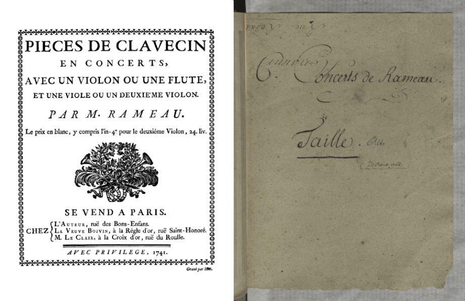 Sendas portada de la primera edición de las Pièces de clavecin en Concerts [Paris, 1741] y de los Six Concerts Transcrits en Sextuor [1768], con música de Jean-Philippe rameau [Gallica, BnF].