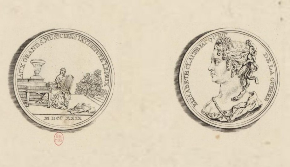 Retrato de Elisabeth Claude Jacquet de la Guerre, grabado de Louis Crépy [1729, BnF, département de la Musique], representado en la edición de Le Parnasse François de Titon du Tillet [1732].