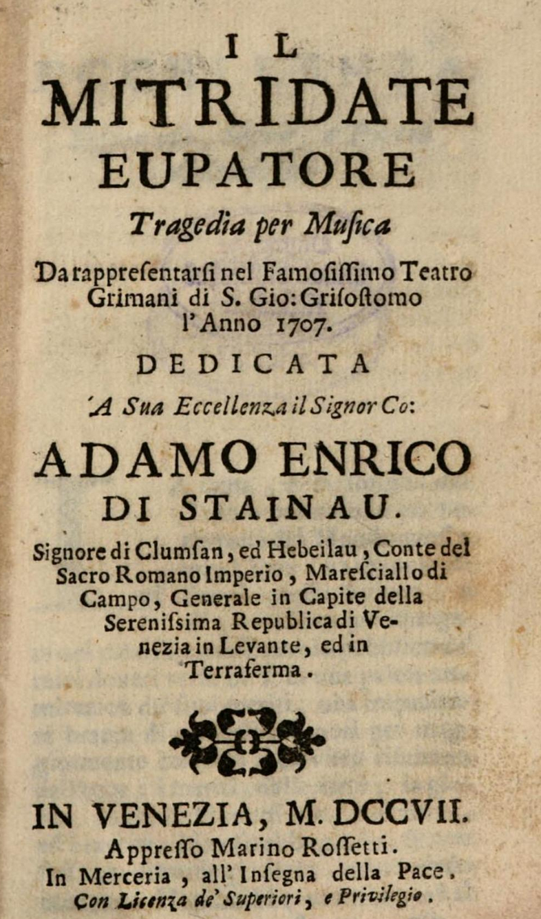 Portada del libreto de Il Mitridate Eupatore, de Girolamo Frigimelica Roberti [Marino Rossetti, Venezia, 1707].
