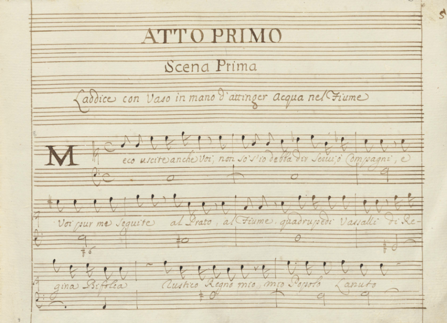 Inicio del acto I de Il Mitridate Eupatore, en la versión de Alessandro Scarlatti [copista veneciano, c. 1707/15, Staatsbibliothek zu Berlin].