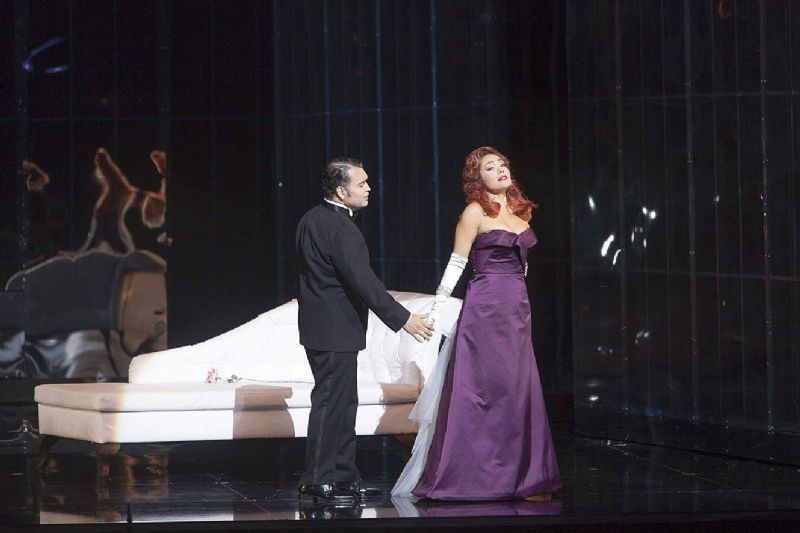 En un principio la gran caja/jaula de cristal/espejo que protagoniza la escenografía unida a un mínimo atrezzo compuesto por apenas tres elementos (diván, escritorio y mesa de juego) nos incitan a pensar en otra propuesta más que incide en el minimalismo y un supuesto low-cost como tarjetas de visita y que recuerda lejanamente a la conocida producción de Lucia di Lammermoor firmada por Emilio Sagi que en varias ocasiones se ha podido ver en el Teatro Campoamor. La transposición temporal a los años 50 del pasado siglo, con una estética cinematográfica y una Violetta ataviada a lo Rita Hayworth, no aporta gran cosa en términos escénicos más allá de subrayar las grandísimas diferencias sociales de la España de posguerra y la enorme superficialidad de las clases altas. Su ubicación en Madrid es apenas perceptible más allá de determinados detalles de vestuario o la presencia de tricornios en la escena de la fiesta en casa de Flora. No obstante Susana Gómez tiene buenas ideas y aprovecha el preludio de la obra como punto de partida de una historia contada en flashback, de una Violetta moribunda que recuerda entre sueño y pesadilla las vivencias que más han marcado sus postreros momentos vitales.