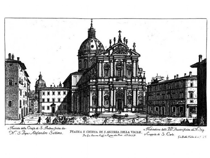 La primera, obra de Francesco Grimaldi y Giacomo della Porta y con una fantástica cúpula, quizás la más espectacular de Roma después de la de San Pedro, sustituye a la de Sant'Andrea del Quirinale prevista en el drama de Victorien Sardou (Paris 1831-1908), del que luego hablaremos. Situada en el actual Corso Vittorio Emmanuelle, en ella se refugia Angelotti fugado del Castel Sant'Angelo y encuentra la ayuda del pintor Mario Cavaradossi, que en este momento, se dedica a pintar una Maria Maddalena para estar cerca de su amante Floria Tosca sin despertar sospechas entre las autoridades eclesiásticas, él educado en Francia, ateo y Volteriano.