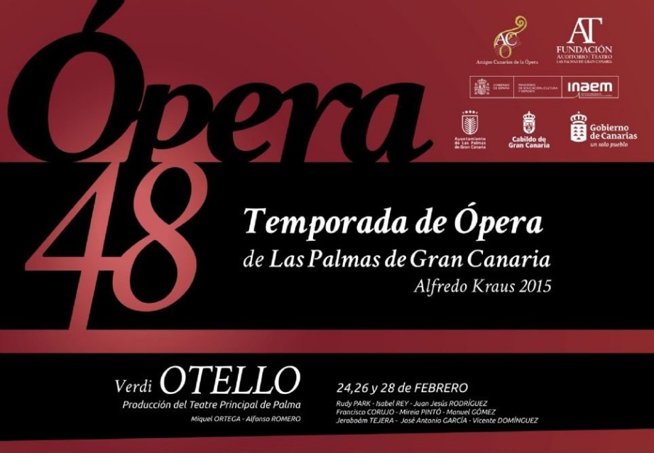 La 48º temporda de ópera de la Asociación de Amigos Canarios de la Ópera (ACO) en Las Palmas, la primera bajo dirección artística de Ulises Jaén, en reemplazo de Mario Pontiggia, se extenderá del 24 de febrero al 31 de mayo de 2015 en el Teatro Pérez Galdós. Su programación comienza este mes de febrero con tres funciones (martes 24, jueves 26 y sábado 28) del Otello de Verdi, protagonizado por el tenor coreano Rudy Park, junto a la soprano Isabel Rey como Desdémona y el barítono Juan Jesús Rodríguez como Yago. La dirección musical correrá a cargo de Miquel Ortega y la dirección escénica lleva la firma de Alfonso Romero.