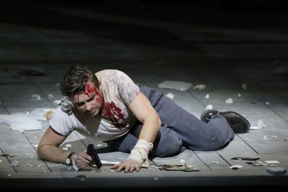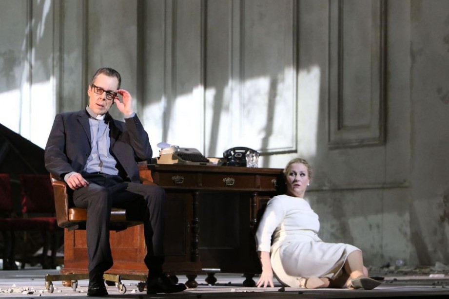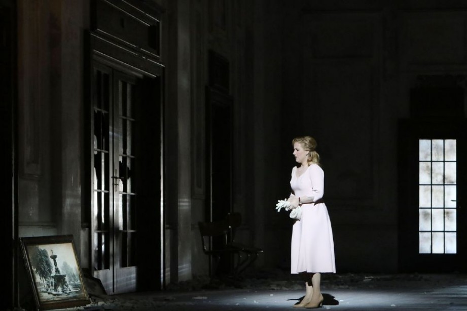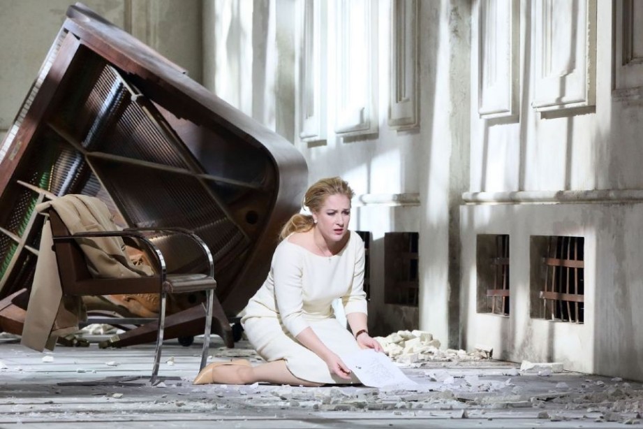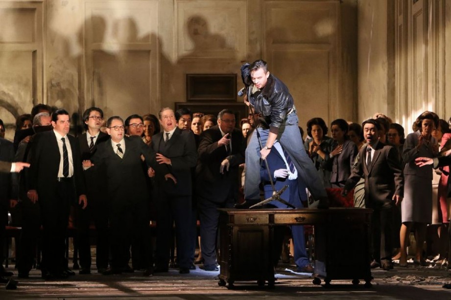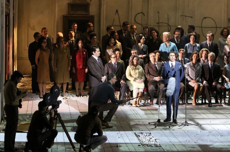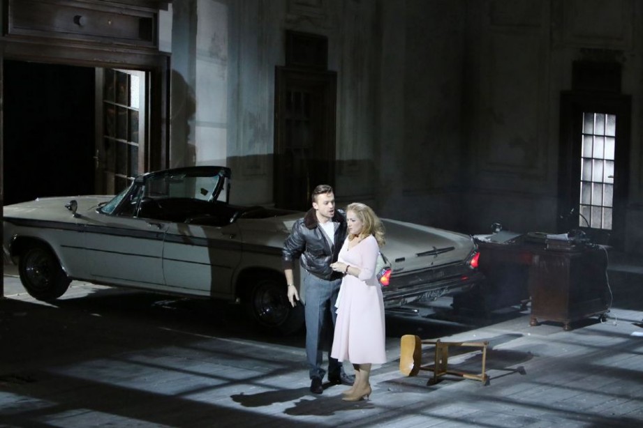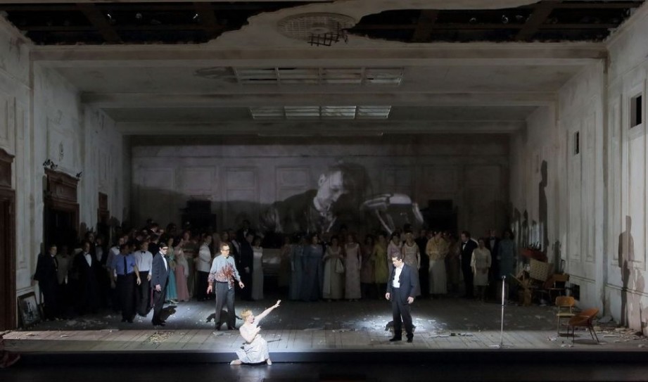 La nueva producción corría, en el apartado escénico, a cargo de Barbara Wysocka, una directora procedente del mundo del teatro, que con esta Lucia hacía de hecho su debut con un gran título del repertorio operístico, tras haber tenido entre manos varias obras de menor entidad en sus años en Varsovia. Su propuesta tiene un relativo atractivo estético pero hace aguas por la ausencia total de cualquier dramaturgia consistente. Wysocka sitúa la acción en los Estados Unidos, en tiempo de la familia Kennedy (cuyas fotos ilustran el programa de mano de la representación), con Edgardo caracterizado como James Dean y con Lucia convertida en una suerte de primera dama, una mujer de Estado traicionada, herida y vulnerable que finalmente pierde el juicio. En escena volvíamos a tener una escenografía única, desafortunada moda cuando falta el ingenio. En este caso, un gran salón en ruinas en el que se desarrolla toda la acción original de Walter Scott, con leves, puntuales y arbitrarios cambios de atrezzo e iluminación. Como decíamos, al espectáculo le falta dramaturgia por doquier, quedando en poco más que una ocurrente y fotogénica traslación del libreto a otras coordenadas.