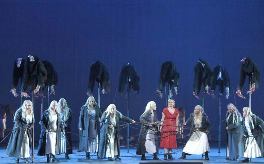 En la propuesta de Kriegenburg entendemos que Die Walküre representa más un momento transitorio que una pieza fundamental. Y es que no terminan de funcionar ni el primer acto, en el que los figurantes incordian un tanto la soledad inquietante y pura del encuentro y descubrimiento entre Siegmund y Sieglinde, ni los dos siguientes, el segundo por la ausencia general de dramaturgia, con un escenario casi anónimo, y el tercero por resultar convencional y un tanto decepcionante. Quizá lo más relevante sea en este caso lo que sucede en torno a la consabida cabalgata de las walkirias. Y es que antes del inicio mismo de la música, se representa una extensa e insistente coreografía de un nutrido grupo de figurantes femeninas, que como si fuesen los caballos que llevan a las walkirias, recorren una y otra vez el escenario haciendo sonar sus pasos de forma rítmica y acompasada. Evidentemente es una provocación meditada y pretendida, y lo cierto es que funciona como un resorte porque conforme se alargaban los minutos de la performance, el público comenzó a manifestarse a favor y en contra sin miramientos.