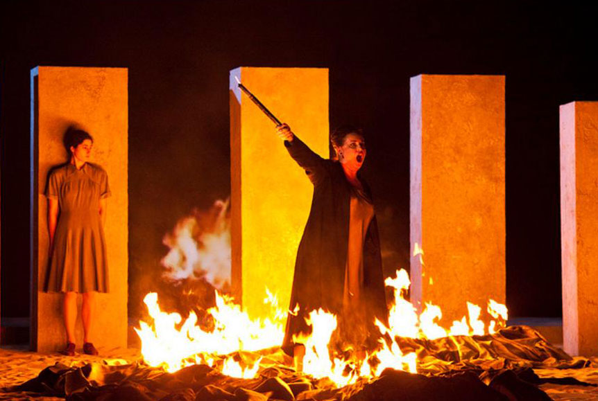 La producción de Daniele Abbado se reponían en Londres tras su estreno en 2013. Coproducción con Milán, Barcelona y Chicago, pretende ofrecer una transposición temporal de la historia hacia mediados del siglo XX tomando como referencia la opresión al pueblo judio con una escenografia del primer acto que emula al memorial del holocausto en Berlin, y unas proyecciones más o menos omnipresentes que no siempre parecen tener una clara razón de ser.