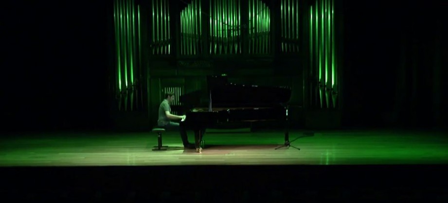 Si la semana pasada comentaba que la experiencia en su relación auditiva y visual podría haberse mejorado con algo más de dinamismo, en esta ocasión el resultado me preció fantástico y muy logrado. No soy una de esas personas a la que llaman sinestésicos, en absoluto. Si bien la música me provoca múltiples emociones, nunca he conseguido asimilar un sonido concreto o tonalidad a un color, número o evocación emocional, como les sucede a otros. Sin embargo, me descubrí escrutando cada una de las breves joyas pianísticas seleccionadas para la ocasión en busca de elementos comunes entre ellas y a su vez con los colores pertinentes. Scriabin muestra en su piano un universo maravilloso, ejemplo de su mundo interior, pero también de influencias del impresionismo parisino y del romanticismo centroeuropeo. Debussy, Ravel o Chopin parecen transitar por su teclado de manera fascinante, pasados por el tamiz de su escritura tan particular y sobre de su tratamiento armónico característico y complejo. Uno observó, pues, algunas particularidades: el Re [amarillo soleado] es en efecto luminoso, brillante y casi mediterráneo; el Do [rojo puro] y rojo oscuro [Fa] destilan pasión y energía; Mi bemol [azul acero] y el Si bemol son realmente sombríos, plúmbeos y pesantes. En otras notas y colores pueden encontrarse, sin embargo, características que bien podrían adherirse a otro sonido/color. En cualquier caso, y se sea capaz de asociar las cualidades entre ellos o no, la experiencia resultó de lo más inspirador. Magnífico el trabajo de iluminación por toda la sala, inundando no solo el escenario –qué hermoso ver los colores y tonalidades reflejados en los tubos del órgano–, sino también en el patio de butacas, en los programas de mano, los abrigos, las manos de los asistentes y el propio piano.