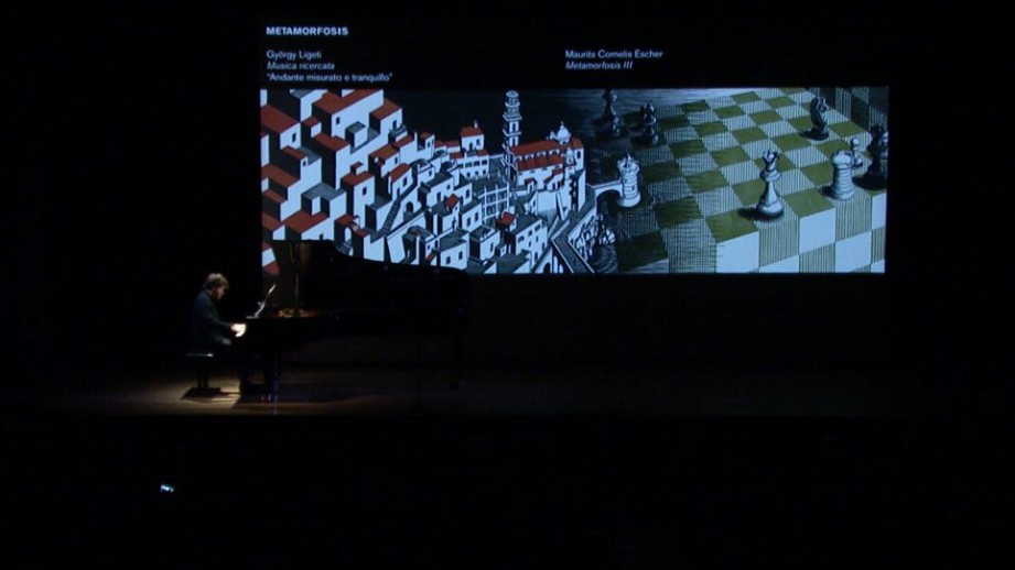 La segunda parte se abrió con Musica ricercata, una composición tan breve como monumental, que Ligeti firmara entre 1951 y 1953. Obra con claras influencias de Bartók y Stravinsky, se trata de su primer gran desafío pianístico, a pesar de que la tonalidad es todavía el caballo de batalla que lo sustenta. Aun así, la obra goza de esa complejidad bellamente propuesta por Ligeti, con un factor melódico fascinante y el permanente y cuidado trabajo rítmico. Ligeti juega aquí a autolimitarse en el uso de notas de la escala cromática, que inicia tan solo con dos en la primera sección, para completar el total cromático en la última de ellas. Musica ricercata es sin duda uno de sus momentos álgidos para piano y una de sus obras más reproducidas, alabadas e inspiradoras para varias generaciones posteriores. Magnífica la proyección simultánea del inmenso grabado Metamorphosis III [1967-1968], reproducido aquí en un continuum lineal –la única manera, por otra parte, de hacerla visible al completo con garantías– de una franja que se desplazó de principio a fin, coordinada a la perfección con la duración de la obra pianística. Un trabajo magnífico del equipo de la Juan March, que viene a suplir las carencias de dinamismo que comentaba en mi crítica de su concierto inaugural con Debussy. Se cerró el concierto con un último bloque titulado Universos infinitos, interpretando para ello Galamb borong y L’escalier du diable, esta último sobre la proyección de una de las tan célebres escenas imposibles de Escher.