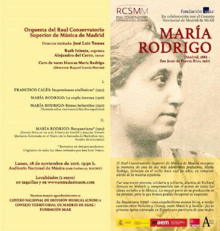 María Rodrigo es una de las compositoras españolas más importantes del siglo XX, María Rodrigo murió olvidada en el exilio en Puerto Rico. Fue la primera mujer compositora profesional de la historia de la música española, y pionera en su pasión por la divulgación de la música clásica entre la infancia, la juventud y las clases humildes. Fue también la primera mujer en estrenar una ópera en España.