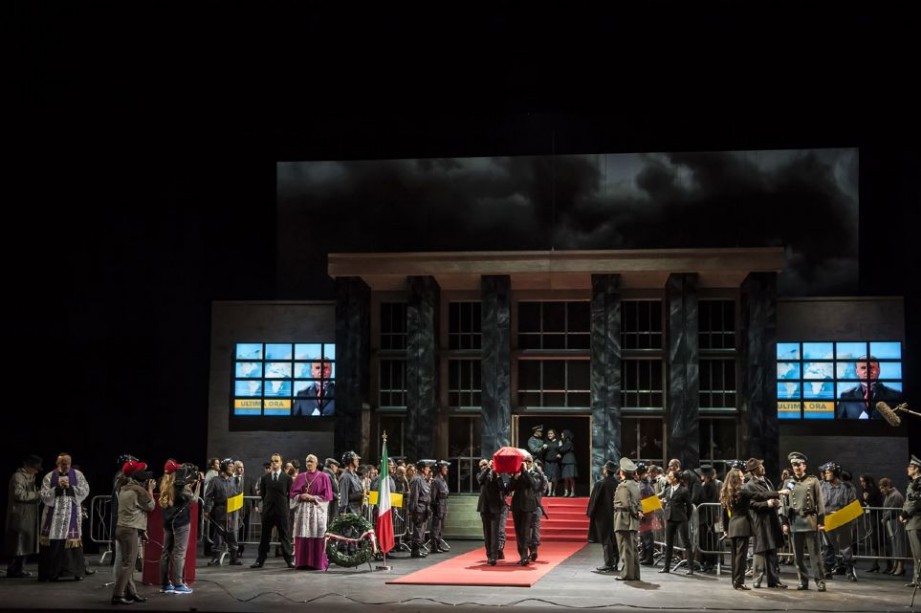 La producción de Davide Livermore creada y pensada para el 150 aniversario del Estado Italiano se basa en la crítica y la reivindicación. La denuncia de la connivencia con la mafia de las instituciones y poderes fácticos del Estado, la abulia del parlamento, la corrupción política, así como la alienación del pueblo ante la televisión, los móviles y demás avances tecnológicos que cimentan la preponderancia del elemento audiovisual en el mundo que vivimos. Ciertamente, no parece un melodrama romántico italiano adaptado a las cracterísticas de la Gran Opera el vehículo más adecuado para ello. Se necesitaría mucho, pero mucho, talento y sabiduría para que funcione. Que Verdi entrara a fondo en el tema político y fuera un elemento clave en el Risorgimento tampoco parece justificación para todo. El caso es que la propuesta y la idea que la sostiene languidece poco a poco, hasta derivar en un montaje aburrido, con una caracterización de personajes y movimiento escénico poco estimulante cuando no sonrojante (como el bailecito del coro mientras Elena intepreta el bolero), además de quedar diluida la relación padre-hijo que es lo que más interesaba a Verdi. Precisamente el coro, que estuvo bien, no alcanzó el nivel habitual en Les Arts, sonando un tanto deshilachado y con notas extremas ácidas en la voces femeninas, seguramente incómodo por su disposición escénica a lo largo de la representación.