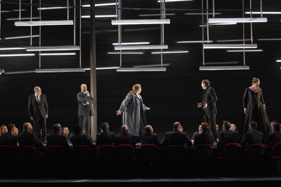 A excepción de unas cuantas ideas muy acertadas –los focos rojos de intensidad variable, que pueden indicar tanto la luz que las Nornas atisban al amanecer como el círculo de fuego que rodea la roca de Brunilde; los escombros de edificios y otros objetos, que se encienden de luz escarlata para la hoguera final; el juego de colores, blanco-negro-rojo, en vestuario y decorado–, la puesta en escena y la consecuente atmósfera lucen achatadas y decepcionantes. La “roca de la walquiria” es al fin y al cabo una cama desecha ante la cual se dicen adiós Brunilde y Sigfrido, sucesivamente reemplazada por una mesita y dos sillas plegadizas para el encuentro entre la protagonista y Waltraute (la mezzo-soprano escocesa convence muy poco, tanto en este papel como en el de la segunda Norn). Es como si los realizadores hubieran querido enfatizar el contraste entre la belleza y grandiosidad de la música wagneriana y una puesta en escena de lo más esencial: esto puede resultar una idea fantástica, a condición de seguir transmitiendo una sensación de opulencia y poder, puesto que Gunther y Gutrune son la familia real de los Gibichungs, es un reino humano, pero aún reino, sede del poder perdido por los dioses. Son en cambio muy humildes y en tono menor todas las escenas, incluso el funeral de Sigfrido con el fratricidio de Hagen: sólo la escena de la inmolación transmite cierta solemnidad, gracias a la personalidad de la protagonista. La del segundo acto se me antojó la escenografía más desafortunada (esos largos neones, que se encienden en número mayor o menor, según lo pide la escena, que irán bajando hacia el escenario cerrando claustrofóbicamente la atmósfera del reconocimiento de Sigfrido en el tercer acto), con Gunther y Hagen que no sólo visten sino actúan también como burócratas de una escualida empresa, y Gutrune que parece más bien la secretaria del ejecutivo que la hermana del rey. Igualmente ineficaces, desde el punto de vista teatral, aparecen el encuentro nocturno entre Hagen y Alberich – sentados tras un escritorio en la media luz – y el sombrío, poderoso monólogo “Hier sitz’ ich zur Wacht” de Hagen, que sigue con su vela sin levantarse del silloncito rojo de oficina... Me pareció discutible también, en el tercer acto, la idea de transformar la enorme mesa de reuniones en una tarima para el coro y los demás personajes, entorpeciendo así la subida y bajada de todos pero especialmente de Christine Goerke, una no agilísima Brunilde; y más torpe aún el inexplicable ir y venir de chaquetas y lanzas de los hombres que se arman tras la llamada de Hagen.