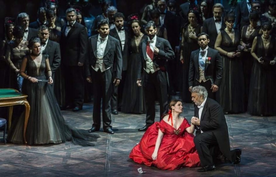 Muy flojo, sin interés alguno, el Alfredo Germont del tenor Arturo Chacón-Cruz, de voz desimpostada, sin liberar, apoyada en la nada, timbre mate y poco atractivo, fraseo aburrido. En la zona alta gana algo de brillo y posición, aunque emitió un irrisorio Do agudo al final de la cabaletta (sólo una estrofa) “Oh mio rimorso”, que bien podría haberse ahorrado. Y como Papá Germont, Plácido Domingo. Poco sentido tiene insistir en que no es barítono, que el fiato es corto, que le falta ductilidad para un papel con una escritura llena de ribetes belcantistas, cuando nada más aparecer y entona “Madamigella Valery!” se impone por su personalidad, su carisma, sus acentos, propios de quien es hace mucho un mito viviente de la ópera. No deja de sorprender que su espléndido y singular timbre esté aún bastante íntegro (con más brillo y esmalte que el tenor de la función que podría ser su nieto) y se debe resaltar el mérito de cantar la habitualmente suprimida cabaletta “No non udrai rimproveri” (una estrofa), que le planteó no pocos problemas para ajustar el tempo de la pieza en un momento en que, además, la fatiga ya se cernía sobre el veterano cantante. Estamos ante un animal de teatro y una fuerza de la Naturaleza, de esas que, prácticamente, se sitúan por encima del bien y del mal y de cualquier análisis. Quien suscribe, después de 28 años acudiendo a la ópera en directo y viéndole año tras año sobre los escenarios -más de 50 veces en total-, sólo puede expresar una mezcla de alegría, perplejidad y admiración ante la energía, las aún estimables condiciones vocales y el entusiasmo de quien necesita el teatro como el aire que respira.