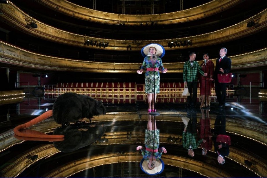 Por tanto, si se decide representar -acertadamente en mi opinión- estas obras menos conocidas de dos compositores tan representativos de nuestro género como son Giménez y Vives (que colabora con el sevillano en La Gatita Blanca) y encuadradas en ese capítulo de la psicalipsis, claro que se puede y se debe realizar una adaptación o reconducción de algunos pasajes del libreto a los tiempos actuales, incluso una “versión libre” -aunque confieso que cuando leo esto ya me entra cierta desazón-, pero con el mayor talento y sensibilidad posible. Hace poco y en esa línea, pudo verse en el propio Teatro de la Zarzuela un espectáculo que funcionaba muy bien firmado por Lluis Pasqual con La Viejecita y Chateaux Margaux. En esta ocasión la” versión libre” de Enrique Viana y su montaje con escenografía de Daniel Bianco, director del Teatro, en la que, además, se altera toda la disposición del recinto, merece, efectivamente, el apelativo de “despropósito cómico lírico en un acto” usado por el propio Sr. Viana. El escenario se coloca en pleno patio de butacas, al final del cual se ubica la orquesta. En el proscenio se habilita una grada para el público que, además de en esa zona, sólo se coloca en los palcos laterales y las localidades de primera fila de primero, segundo y tercer piso, quedando muy reducido el aforo del teatro. Y todo ello ¿qué aporta? –además de alterar la acústica de la sala y la comodidad de los espectadores-, nada de nada. Como nada aporta una escenografía vacua con algún que otro armatoste absurdo sobre el escenario, algún elemento más vistoso que otro –todo hay que decirlo- y una dirección escénica que se debate entre lo ridiculamente pomposo y autocomplaciente, lo pretendidamente gracioso, pero que esconde una absoluta falta de sentido del humor, lo vulgar y burdamente inspirado en lo peor del mundo televisivo actual, lo cargante y lo pasado de rosca (sonrojante la “idea” de las dos burbujas). Que se repartan bizcochos de soletilla entre el público mientras se interpreta el genial número del chocolatito en La Gatita Blanca –como en los espectáculos de La Cubana, ejemplar compañía teatral en su género, por otra parte- simboliza bien la escasez de ideas y lo tan trivial como pueril de la propuesta.