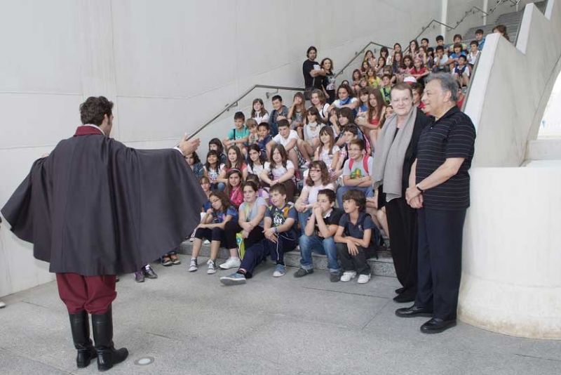 El Presidente del Festival del Mediterraneo, Zubin Mehta y la Intendente del Palau de les Arts Reina Sofía, Helga Schmidt, han participado esta mañana junto a un grupo de estudiantes en la actividad ‘En busca de Florestan'. Esta iniciativa, que forma parte del Proyecto Didáctico del centro de artes valenciano, pretende acercar a los más pequeños la ópera Fidelio de Beethoven. Durante este recorrido temático por el Palau de les Arts Reina Sofía, los estudiantes, acompañados por actores, se adentran en el argumento de Fidelio, la única ópera compuesta por Ludwig van Beethoven y que forma parte de la programación del IV Festival del Mediterraneo. Al comienzo de esta aventura, Leonore trama un plan para que el grupo la ayude a buscar la celda donde está preso su amado Florestan. Una conversación mantenida entre Rocco y Don Pizarro, otros dos de los personajes de la ópera, es la clave que los conduce hasta el lugar en el que se encuentra encerrado el amor de Leonore. En total, el Palau de les Arts ha programado diez sesiones de carácter educativo desde el pasado lunes día 6 al viernes 10 de junio. El sábado 11 y el domingo 12 el enclave cultural ha establecido cuatro funciones familiares, abiertas al público general, a las 12.00 h y a las 17.00 h cada día. Las localidades para ‘En busca de Florestan', de venta exclusiva en las taquillas del enclave operístico, tienen un precio único de 5 euros para niños y 8 euros para adultos (a partir de 13 años). Las sesiones están limitadas a 80 participantes, con un máximo de 20 plazas de adulto.