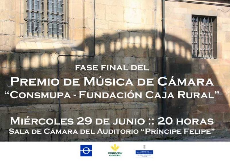 El próximo día 29 de junio se celebrará en la Sala de Cámara del Auditorio "Príncipe Felipe" de Oviedo la fase final del Premio de Música de Cámara "CONSMUPA-Fundación Caja Rural", organizado por el Conservatorio Superior de Música del Principado de Asturias y patrocinado por la Fundación Caja Rural de Asturias. En esta final actuarán cinco agrupaciones, que en actuaciones de 15 minutos deberán hacerse con el favor del público asistente y del tribunal. El tribunal estará integrado por Cosme Marina, Aurelio Martínez Seco, Pachi Poncela, Manuel Aguadé y representantes del Conservatorio, sumándose a la valoración del tribunal el veredicto del público asistente. Actuarán en esta final el Trío "Peñabril", integrado por Emma Ortega (violín), Miryam Ortega (violín) y María Peñalver (piano); el Trío "Weimar", formado por Claudia Ortiz (violín), Enrique Toribio (contrabajo) y Marta Moldenhauer (piano); el Trío "Triovetus", compuesto por Joana García (violín), Amaia López (violoncello) y por Andrés Martínez (piano); el Trío "Rekucka" formado por Laura Díaz (flauta travesera), Manuel del Valle (violín) y Diego Ruenes (piano); y para finalizar el Trío "Ohne Opus" que está integrado por Paula Angulo (clarinete), Guillermo García (violonchelo) y Marta Fernández (piano).
