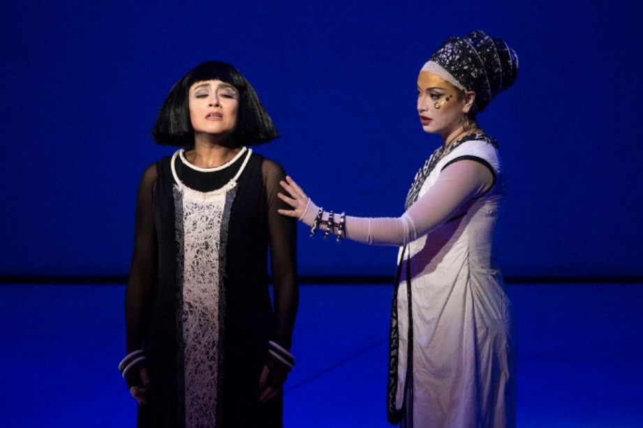 El trabajo del director escénico se nota tanto en la perfecta coordinación entre los cantantes y las imágenes que se suceden en el fondo, como en el montaje que se sirve también del patio de butacas para dar más movimiento e interés a la acción. Notable la coreografía de Monica Casadei y la ejecución de la Compañía de Artemis Danza, ataviada como las tropas imperiales de La guerra de las galaxias. El vestuario de Silvia Aymonino es elegante y atemporal. Exceptuados Aida y su padre Amonasro que visten de negro, signo de tristeza, los demás personajes visten de blanco, pero a veces los indumentos toman diferentes colores iluminados por las espléndidas luces de Fabio Barettin, que subrayan los momentos fundamentales del espectáculo.