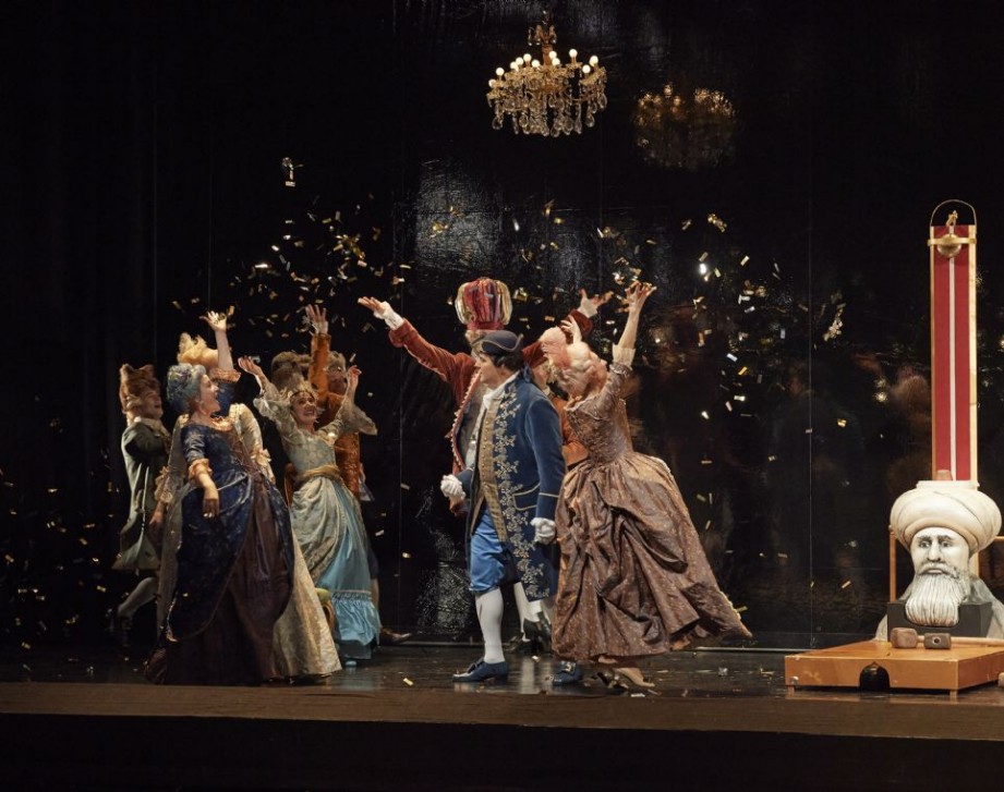 La segunda parte del espectáculo se abre, con paz sea dicho de Mozart, con el canto de la plegaria entonada por el muezín, y en medio de los orantes, vemos también a Pedrillo y a Blonde: obligados a convertirse al Islam, rezan con los demás cinco veces al día.