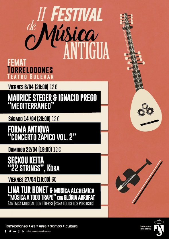 Durante el próximo mes de abril, Torrelodones celebra en el Teatro Bulevar la segunda edición del Festival de Música Antigua de Torrelodones [FEMAT]. La presente edición abre sus puertas a dos de los artistas internacionales mas importantes del momento, el flautista suizo Maurice Steger, que ofrecerá un concierto a dúo con el clavecinista Ignacio Prego, y el senegalés Seckou Keita, uno de los intérpretes de referencia de la kora. Con éste último concierto, el FEMAT materializa su intención de expandir el concepto de música antigua a otras culturas y tradiciones ancestrales, algo que ha estado presente desde su nacimiento. El festival continúa además su firme apuesta por artistas españoles de referencia internacional, contando en esta ocasión con la formación Forma Antiqva, que presenta su nuevo proyecto Concerto Zapico Vol. 2. Dos semanas mas tarde sera el turno de Música Alchémica, liderada por la violinista ibicenca Lina Tur Bonet, que junto a la artista Glória Arrufat, presentarán Música a todo trapo, una fantasía musical con espectáculo de títeres y sombras orientada a los mas pequeños. El FEMAT, una firme apuesta de la Concejalía de Cultura del Ayuntamiento de Torrelodones, aspira a convertirse con esta excelente programación, y tras el paso en 2017 de artistas de la talla de Fahmi Alqhai, o los grupos La Ritirata, Los Afectos Diversos y Tiento Nuovo, 'en uno de los festivales mas importantes de la Comunidad de Madrid, en palabras de su director artístico, Ignacio Prego.
