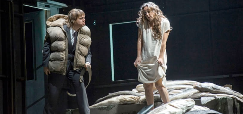 El director de escena noruego Ole Anders Tandberg ambienta la trama en su tierra y la hacienda rusa pasa a ser un emporio de pescado, de enormes bacalaos que parecen ser el símbolo de pretendida filiación fálica de ese machismo que oprime a Katerina y que el montaje pretende subrayar como sucede en la escena de la violación de Aksinja. De este modo, el suegro Boris, como paradigma de macho brutal (ya decadente el hombre, bien es verdad) aparece siempre en escena sosteniendo dos enormes pescados, lo cual termina resultando ridículo y provocando hilaridad, al igual que la constante presencia de bacalaos o enormes atunes en el escenario, particularmente en la plataforma central donde se desarrolla la mayor parte de la trama, ya de por sí irregular y resbaladiza, imaginen con tanto pescado… Los cantantes tuvieron que realizar auténticos esfuerzos por no dar con sus huesos en el suelo. La culminación de todo este despropósito y ejemplo de falta de talento fue la escena de la comisaría. Además de la crítica social ya aludida que se expone con crudo realismo y en una atmósfera de gran sensualidad y erotismo que incluye un coito en escena, Shostakovich destila también en esta magistral creación sus buenas dosis de ironía y burla que recaen principalmente en el estamento policial, en la autoridad. Pues bien, el director de escena convirtió una genial sátira en una torpe exhibición de chabacanería y trazo grueso con los agentes en calzoncillos planchándose los pantalones después de enchufar el artefacto en sus partes y que culmina con el jefe de la policía violando a Katerina cuando detienen a la pareja de asesinos. En fin, una ópera de naturaleza tan dramática termina provocando las risas del público como si fuera del género buffo. Una pena.