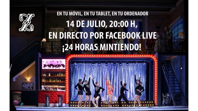 Es la primera vez que el Teatro de la Zarzuela ofrecerá una de sus funciones en directo a través de facebook live, un paso importante para una institución que quiere convertirse en un "teatro único en el mundo y para todos", y "reforzar la proyección internacional del patrimonio musical español", según reza la nota de prensa enviada por el coliseo de la Calle Jovellanos a los medios. La retransmisión se llevará a efecto el próximo sábado 14 de julio gracias a la emisión en directo a través de la plataforma Facebook Live, y de forma gratuita, de la función ¡24 horas mintiendo!.