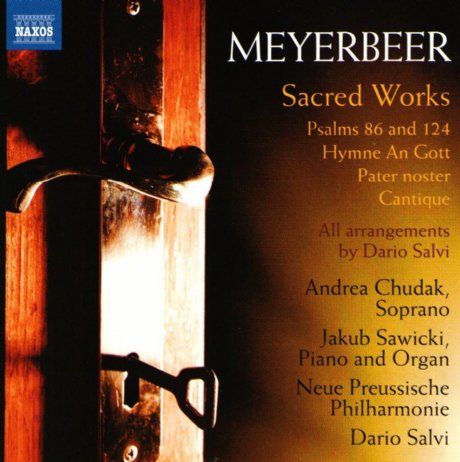Meyerbeer: Zwei Religiöse Gedichte von Jakob Neus, Hymne An Gott, Prélude et Caintique tiré de l’imitation de Jésus-Christ, Psalm 124, Psalm 86, Pater noster, Gottergebenheit. Andrea Chudak, soprano. Jakub Sawick, piano, órgano. Neueu Preussische Philharmonie. Dario Salvi, director musical. Naxos 8.573907 DDD 64 minutos.
