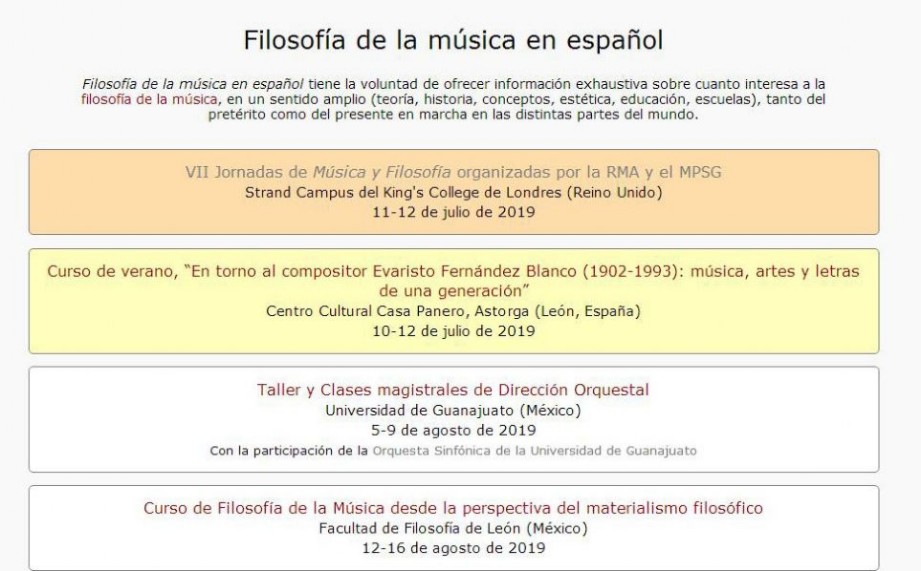 Ya se puede acceder a la página Filosofía de la música en español, una web creada a instancias de la Fundación Gustavo Bueno, diseñada y actualizada por el equipo de trabajo del compositor y director de orquesta Vicente Chuliá, que trata de proporcionar información sobre el campo de la filosofía de la música, teniendo como referente el trabajo desarrollado desde el materialismo filosófico por Gustavo Bueno y el propio Chuliá, autor de un Manual de filosofía de la música de reciente publicación por la editorial Pentalfa. El portal ya informa sobre unas Jornadas de Filosofía y Música que se desarrollarán los días 11 y 12 de julio en el King’s College Londres, así como del Curso de Filosofía de la Música desde la perspectiva del materialismo filosófico y el Taller y Clases magistrales de Dirección Orquestal que desarrollarán Vicente Chuliá en la Facultad de Filosofía de León (México), y el director de orquesta Roberto Beltrán-Zavala [titular de la Sinfónica de la Universidad de Guanajuato] y el propio Chuliá en la Universidad de Guanajuato, respectivamente, durante el mes de agosto. La página de Filosofía de la música española está coordinada por Marié Lavandera Piñero, y cuenta con la colaboración de Alba Leiva Velez, Antonio Lique Fernández y Leoncio González Hevia.