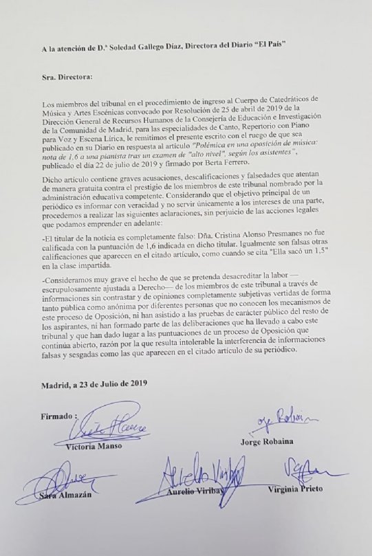 Un día después llega la respuesta de los miembros del tribunal. Victoria Manso, Aurelio Viribay, Virginia Prieto, Jorge Robaina y Sara Almazán acaban de hacer pública una carta a través del Twitter de Viribay, en la que trata de desmentir lo publicado por El País. «Dicho artículo», escriben los firmantes refiriéndose al publicado por el diario, «continene graves acusaciones, descalificaciones y falsedades que atentan de manera gratuita contra el prestigio de los miembros de este tribunal nombrado por la administración educativa correspondiente. Considerando que el objetivo principal de un periódico es informar con veracidad y no servir únicamente a los intereses de una parte, procedemos a realizar las siguientes aclaraciones, sin perjuicio de las acciones legales que podamos emprender en adelante».