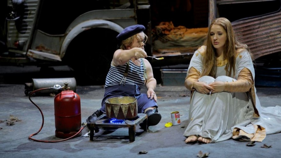 Apenas transcurridos un par de minutos de obertura, una de las emblemáticas de Wagner y que uno no puede disfrutar con la apropiada concentración, a telón bajado, sino que nos distraen de la música con imágenes de una narración videográfica que nos instala en una suerte de road movie de comedia negra. El Venusberg es una furgoneta con una troupe formada por unos seres marginales o salidos del mundo de las variedades del Teatro chino de Manolita Chen. Venus en plan vedette, una drag Queen de raza negra(Le gateau Chocolat), un enano (todos están muy bien en su cometido y no se pone en duda su profesionalidad), además de Tannhäuser vestido de payaso. Los cuatro se dedican a tomar drogas, robar una hamburguesería y hasta atropellar un agente de policía. Ver a Tannhäuser de tal guisa me saca inmediatamente de la obra tanto, como si presenciara un Trovador con Manrico ataviado de un mono de fontanero o una Tosca con la protagonista vestida de esquimal. El supuesto Tannhäuser empieza a cansarse de esta vida, por lo que abandona este particular Venusberg y después de una imagen del valle del Wartburg, aterriza en la colina verde de Bayreuth en la que el coro de peregrinos lo forman los asistentes anuales al Festival. El segundo acto es un ejercicio impecablemente resuelto técnicamente, todo hay que decirlo, de metateatro. En la mitad del escenario hacia abajo vemos una representación en Bayreuth de Tannhäuser considerada clásica (vamos, que debe ser de hace mucho) y en la mitad superior lo que ocurre fuera de escena, entre bambalinas. En mitad del concurso de Minnesänger irrumpe la troupe en el teatro, avanzan por sus dependencias e invaden la escena. Imaginen las situaciones risibles, grotescas, en plan sainete que se producen con personación al final de la policía (llega la forza como en el final del acto primero de la ópera buffa por excelencia, El barbero de Sevilla de Rossini) y colocación de la bandera arco iris sobre el arpa.