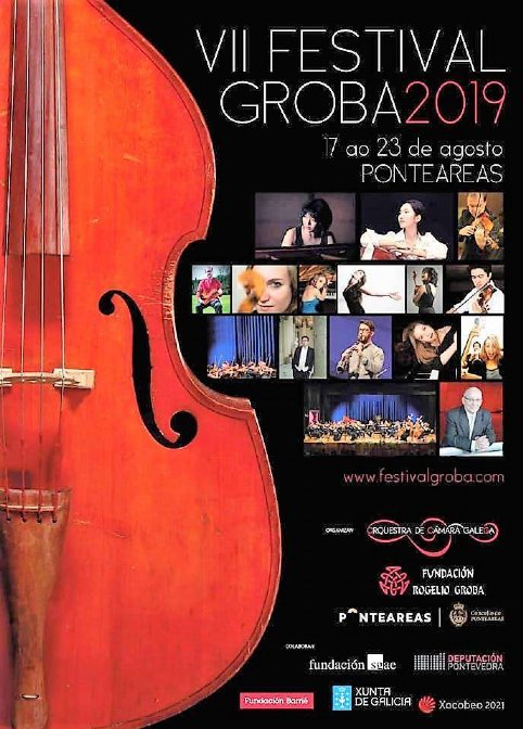 Desde el 17 de agosto y hasta el día 23 del mismo mes se celebra en la localidad gallega de Puenteareas la séptima edición del Festival Groba 2019. La cita, centrada en la música de cámara, rinde homenaje al compositor español Rogelio Groba y, bajo la dirección artística de Rogelio Groba Otero y con la con la colaboración del violinista y gestor Pablo Vidal Vázquez, ofrece la oportunidad de asistir a un total de siete conciertos, todos en el Auditorio Reveriano Soutullo de la citada localidad pontevedresa, siempre a las 21 horas. El sábado 17 de agosto, jornada inaugural del ciclo, ha sido la Orquesta de Cámara Galega la que, bajo la dirección de Rogelio Groba Otero, ha ofrecido el estreno absoluto de la Sinfonía nº 6 de Rogelio Groba. En la misma velada se han dejado oír Danza de Alba y Na Suaviña, del propio Groba [con la soprano Laura del Río y la pianista Gema Arias como protagonistas interpretativos], así como el Trino del diablo de Tartini, en manos de Miranda Liu. Entre los artistas invitados también se encuentran los violinistas Rogelio Groba Otero, Pablo Vidal Vázquez y Koh Grabriel Kameda, la chelista Hee Young Lim, la viola Alba González Becerra, la soprano Laura del Río o los pianistas Javier Vázquez Grela y Elisa D´Auria, entre otros. La cita de hoy miércoles 21 de agosto incluye Álbumes de Tipoloxías, de Rogelio Groba y el Trío en re menor op. 90 «Dumky» de Dvorak. El concierto de clausura del próximo viernes volverá a rendir homenaje a Rogelio Groba, de quien la Orquesta de Cámara Gallega interpretará Carpe Diem, el Concierto en do mayor para violonchelo y orquesta de Haydn y Na Barxa, del propio Groba, interpretada por la soprano Laura del Río y la pianista Gema Arias, bajo la dirección de Roberlio Groba Otero.