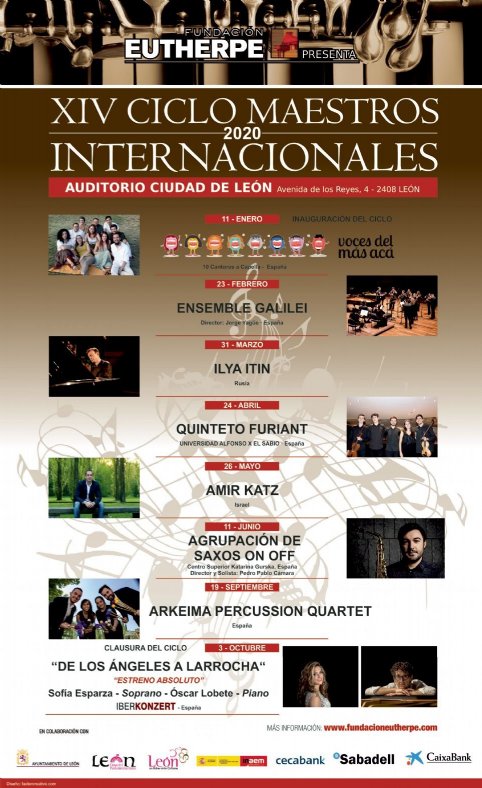 La Fundación Eutherpe de León, que preside Margarita Morais, acaba de dar a conocer el programa de su XIX Ciclo Maestros Internacionales, que acercarán a la ciudad española a artistas de la talla de los pianistas Ilya Itin [31 de marzo] y Amir Katz [5 de mayo]; conjuntos como el coro de cantores a capella Voces del más acá [1 de enero], el Ensemble Galilei [23 de enero], el Quinteto Furiant [24 de abril], Arkeima Percussion Quartet [7 de septiembre], la Agrupación de Saxos ON OFF del Centro Superior Katarina Gurska [6 de junio] y, el 3 de octubre, un estreno absoluto que, bajo el título «De los Ángeles a Larrocha» permitirá oír la voz de la soprano Sofía Esparza, acompañada al piano por Óscar Lobete. Todos los conciertos se ofrecen en el Auditorio de León.