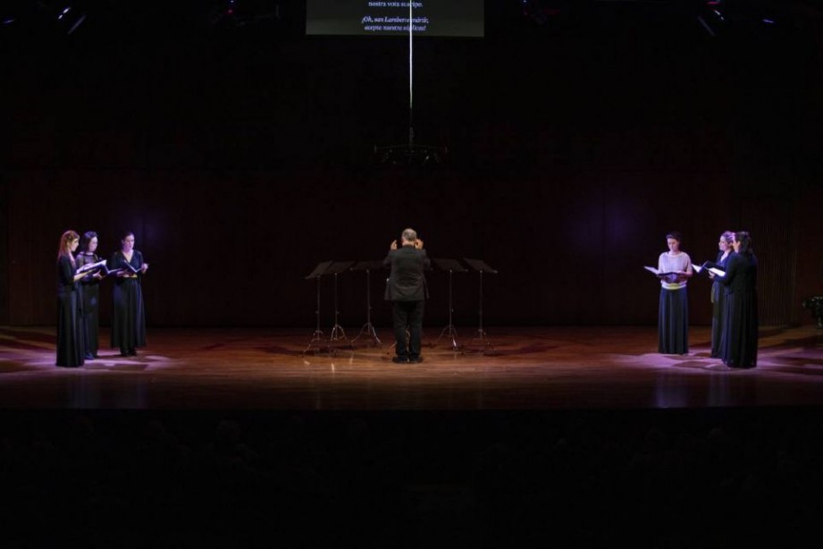 Finalmente, el sexteto femenino se reúne en el centro del escenario para interpretar el tractus Domine, exaudi orationem meam, del citado Gradual de Cluny. En esta ocasión, es Kerlijne Van Nevel quien destaca en los versos a solo. Esta pieza se fusionaría con Narrabo omnia mirabilia, communio del Misal de Stavelot, que incluye algunos recitados que se combinan con tres tríos que van recreando las melodía con bordones inferiores y superiores, dotando de una gran fuerza vocal que culmina al llegar todas a la finalis en unísono con la solista. Momentos como estos, de cierta complejidad vocal y técnica, rompieron con la homogeneidad del concierto y demostraron, una vez más, que Vanden Abeele es uno de los más destacados especialistas en el trabajo de creación de programas para su interpretación. Seguidamente, y para el Angelorum regi Deo de la colección de obras de Isidoro de Sevilla (siglo IX), el director recrea la pieza a través de una monodía, que a mitad de la interpretación se convertirá en un canon a tres voces y que, finalmente, retomará la monodía. Algo similar hace con el Benedicamus Domino final, una secuencia del Gradual de la Abadía de Stravelot, que va ampliando y reduciendo su textura a través de la superposición de voces primero con un organum suspensum, después con un organum purum a la 4.ª superior al que se le añadirá la 5.ª inferior para llegar a una sección central en la que nos encontraremos con una disposición de lo más insólita en forma de fabordón a la inglesa, lenguaje interesante aunque algo anacrónico por ser casi cinco siglos posterior. Sin embargo, a pesar de lo arriesgado de la propuesta, podríamos decir que esta, sin duda, fue la pieza más atractiva del programa.