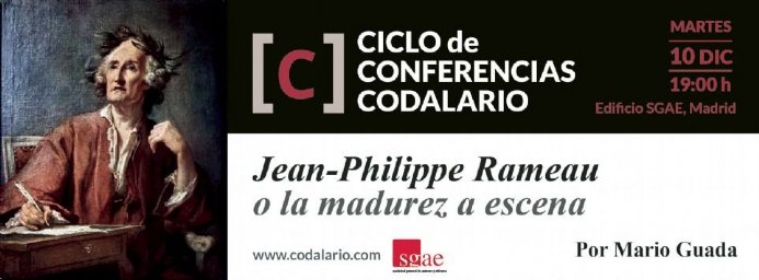 El I Ciclo de Conferencias CODALARIO cerrará el año con la presencia de su redactor jefe, Mario Guada, quien ofrecerá una conferencia centrada en uno de los grandes operistas de la historia, bajo el titulo Jean-Philippe Rameau ou la madurez a escena. Concluye así la primera parte de este ciclo –que continuará en 2020– confeccionado por CODALARIO. La Revista de Música con el fin de ofrecer al público madrileño una cita con algunos de los especialistas más destacados en su ámbito, que puedan ofrecer una visión muy concreta y profunda sobre diversos temas musicales. La conferencia tendrá lugar en el Palacio de Longoria, sede madrileña de la Sociedad General de Autores y Editores, a las 19:00 del martes 10 de diciembre de 2019, con entrada libre. Próximamente se anunciarán las conferencias que protagonizarán este ciclo en 2020, que contarán con nombres como Nuria Blanco, Aurelio M. Seco, Laura Ventura o Álvaro Menéndez entre otros.