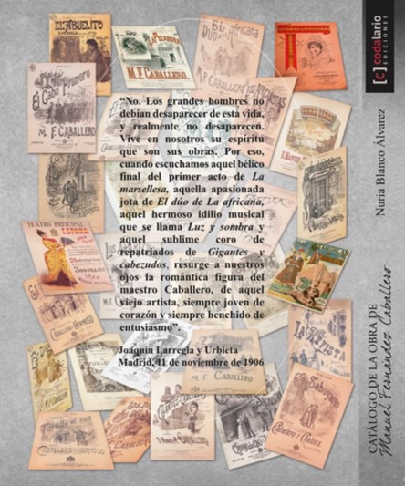 Efectivamente, se trata del primer libro original sobre la figura del compositor, el Catálogo de la obra de Manuel Fernández Caballero publicado, precisamente, por CODALARIO EDICIONES. Una de las principales aportaciones ha sido dar a conocer su obra, una gran parte totalmente desconocida hasta el momento. No solamente consta de los casi dos centenares de zarzuelas que mencionábamos, sino que también incluye un repertorio inédito hasta la fecha con otro tipo de géneros musicales: canciones, cantatas, entremeses, música religiosa y música instrumental, ascendiendo a 275 las obras catalogadas. Hemos realizado sendas fichas para cada una de ellas, que incluyen datos relativos a la obra y a su estreno, incluyendo los números musicales, personajes y tipos de voces en el caso de las zarzuelas, entre otras cuestiones. El trabajo de datación y de adscripción de autoría fue minucioso, especialmente en el caso de libretistas, topándonos con sagas familiares que compartían nombre y apellido, teniendo que discernir entre generaciones en las que ambos, padre e hijo, colaboraban con Caballero. También me parece importante la aportación que realizamos al especificar las fuentes para la localización de partituras y libretos, con el fin de facilitar el acceso a los materiales para que se puedan recuperar obras hoy día olvidadas, pero de enorme calidad y belleza que, sin duda, harían las delicias de artistas y público.