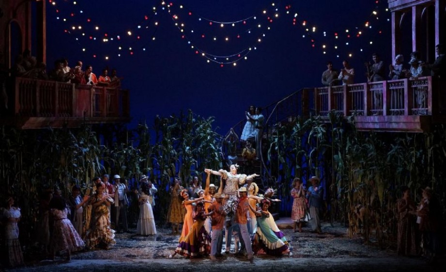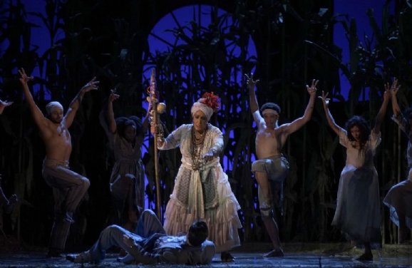 Decepcionante por varias razones la puesta en escena de Carlos Wagner. En primer lugar, porque la escenografía única de Rifail Ajdarpasic se come gran parte del escenario, lo que no es un acierto en una obra llena de escenas de masas y festivas con abundantes danzas y coreografías. A cambio, tampoco es que sea especialmente vistoso el patio de una Hacienda colonial, la fachada a los lados, escalera a la derecha y una vegetación de caña de azúcar excesiva, cuasi opresiva. En segundo lugar, porque el movimiento escénico es más bien torpe y la caracterización de personajes, inexistente. Y en último lugar, porque el montaje es absolutamente esclerótico teatralmente, sin fuerza teatral ni dramática. Además, no aprovecha, ni incide en las partes más interesantes del libreto, las de denuncia social ya mencionadas, la esclavitud, la denuncia del trato humillante a los esclavos, el abuso de las clases dominantes y su racismo, el machismo… Estupendas las coreografías de Nuria Castejón y gran actuación del cuerpo de baile.