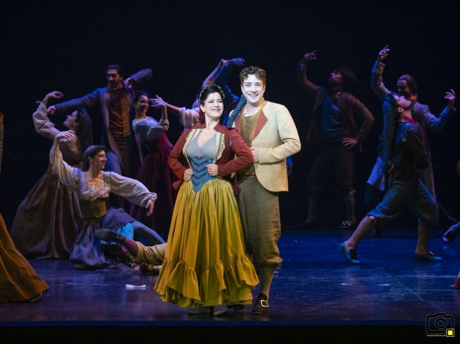 La puesta en escena de Alfredo Sanzol que vimos en el Campoamor -nueva producción del Teatro de la Zarzuela- no aporta nada. Un escenario sin elementos de atrezzo alguno –salvo una puntual silla de manos-, ni decorados, con un fondo negro y unos muros móviles, totalmente prescindibles, que acortaban el espacio escénico. Lo único que llenaba el escenario era la masa coral y los bailarines cuando salían a escena, y la nota de color la aportaba el vestuario de Alejandro Andújar. No tuvo nada especial la dirección escénica pues, en general, todos los cantantes y coro se disponían en línea, al borde del escenario para sus intervenciones, desde luego, muy cómodo para los artistas, pero monótono para el espectador. Las coreografías de Antonio Ruz parecían ser una modernización, en versión libre, de las tradicionales seguidillas y jotas, difíciles de identificar con las originales. Cierto es que la jota de esta obra no era aragonesa, sino de estudiantes, bien acompañada en esta ocasión por la Orquesta Langreana de Plectro. El Coro Capilla Polifónica Ciudad de Oviedo, dirigido por Pablo Moras, actuó con su habitual buen hacer, aun faltando cierto desparpajo escénico a los guardias, que no vocal, pues sus intervenciones fueron muy adecuadas, al igual que las del resto de la agrupación, destacando su excelente dicción y empaste, si bien a las mujeres les faltó algo de peso en los agudos.