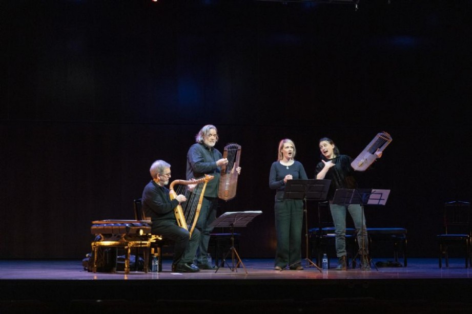 El concierto continuó con «Welund him be wurman wræces cunnade», elegía anglosajona llamada Deor, interpretada por los cuatro componentes del grupo, en el que tanto Marti, Conner y Bagby nos fueron trasladando por la historia gracias no solo a su vínculo grupal, sino por aquellas modulaciones vocales que son capaces de hacer para darle continuidad a la narración, sin perder afinación, dicción y proyección. Además, en esta elegía se hizo presente por primera vez en el concierto el arpa anglosajona distintiva del director. Ésta acompañó la voz de Marti en la bendición antigua alemana de una casa en Zúrich [«Wola, wiht, taz tu weist»], que curiosamente se distingue de las otras dos piezas [«Fo ic under fot, funde ic hit» y «Kirst, imbi ist hucze!», dos conjuros] por la mezcla del mundo profano y el cristiano. En estos conjuros, en el que buscan «dominar un enjambre de abejas», Stef Conner hace gala de su potente voz, de afinación intachable y de una expresividad en la que realmente nos sentimos protegidos con sus conjuros.