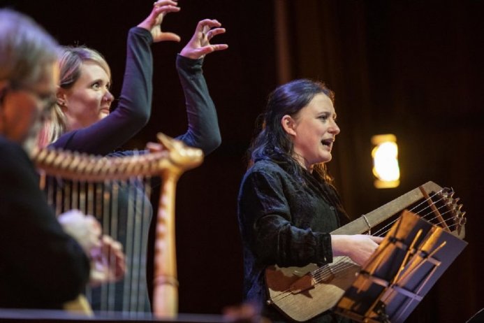 Llega el turno para Sequentia. En el escenario, cuatro sillas rodeadas de tres arpas, dos de ellas anglosajonas, flautas de madera y una de hueso de cisne, y un pandero, formaban parte de la escena en la que aparecieron Norbert Rodenkirchen, Hanna Marti, Stef Conner y el propio Benjamin Bagby, director y cofundador de la agrupación.