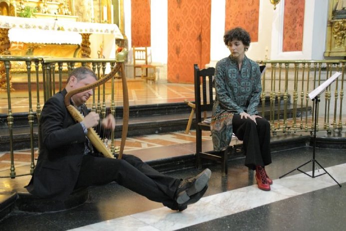 En las tres últimas piezas, el dúo jugó con la sonoridad del espacio, moviéndose por toda la iglesia y aprovechando los recursos acústicos de cada uno de los rincones, algo sin duda muy interesante. Fue en estas secciones de movimiento donde pudimos, en primer lugar, ser verdaderamente conscientes del poderoso sonido del arpa de Vilas, basada en las miniaturas de la Biblia Maciejowsky (s. XIII) y construida por Luís Martínez, así como del excelente trabajo de montaje que había entre los dos músicos. Cabe destacar que el extraordinario trabajo de afinación y de conexión que mantuvieron a lo largo de todo este bloque, que si bien adoleció ligeramente en cuanto a teatralidad en comparación con «Be m’an perdut», ganó en la riqueza de otros elementos musicales. El momento más destacable de esta parte fue, sin duda, «Non es meravelha s’eu chan», donde pudimos disfrutar de nuevo de este histrionismo al que me refiero. De los puntos más sobresalientes del concierto es que Paloma lo interpretó al completo de memoria (algo no tan habitual en las actuaciones de este tipo de repertorio), mientras que Vilas hizo lo mismo en algunas ocasiones.