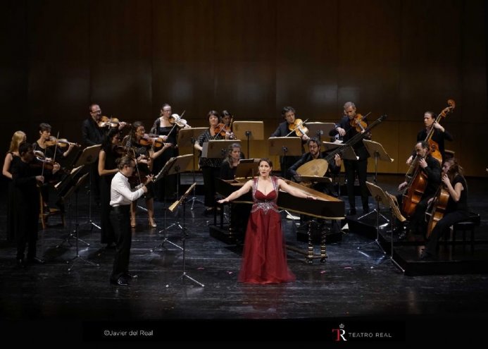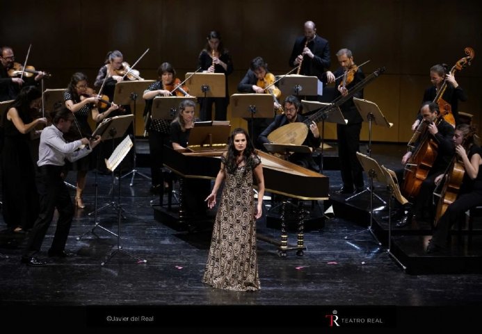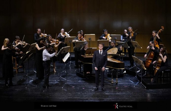 El siempre exigente apartado orquestal corrió a cargo de la agrupación historicista francesa Le Concert de la Loge, conjunto fundado en 2015 por el violinista Julien Chauvin tras la escisión de parte del conjunto del anterior Le Cercle de l’Harmonie, que había cofundado con Jérémie Rhorer. Es un conjunto de amplio espectro, que cubre desde recitales con repertorio barroco hasta el universo escénico y sinfónico-coral de los siglos XVIII y XIX. De hecho, el conjunto se fundó como un homenaje a uno de los eventos musicales más importantes de Francia en la segunda mitad del XVIII: la fundación en 1783 de Le Concert de la Loge Olympique, agrupación que en su momento fue considerada una de las mejores del continente. Si bien Chauvin es un excepcional violinista, como demostró en el acompañamiento del violín obbligato en el aria «Solvente il sole», interpretada sobre un hermoso sonido sustentando en una línea muy fluida, un virtuosismo bien entendido y una afinación pulcra al extremo, el conjunto que ha conformado no puede considerarse aún entre las orquestas historicistas punteras de su país, ni de Europa. El comienzo notablemente desajustado de los violines al arranque del aria inicial del recital, por ejemplo, además de un sonido general algo falto de empaque –que no energía, porque no es lo mismo– demostraron que queda camino por recorrer, aunque los mimbres son muy buenos. Bien es cierto que la complicada acústica de la escena del Real para una agrupación de este tipo –ya ha pasado antes–, incluso con la ayuda de la caja acústica móvil, no facilitó su labor. En ciertos momentos, cuando uno recibía el sonido de la orquesta, parecía no haber una correspondencia entre el nutrido número de efectivos –con una sección de cuerda nada menos que 5/4/2/3/1– y el impacto y la densidad sonoros. No obstante, el trabajo está ahí y es muy bueno, con un equilibrio muy interesante entre líneas, una afinación y empaste en los violines de notable calidad, un bajo continuo maravillosamente construido y ofreciendo destellos a lo largo de la velada que no pueden ni deben pasarse por alto: los detalles de filigrana ofrecidos en «Frema pur»; el gran trabajo en los oboes barrocos de Laura Duthuillé y Vincent Blanchard en los momentos más destacados como doblando a los violines en varias de las arias, aportando un color muy interesante; el elegante discurso orquestal en «Tu vorresti col tuo pianto», con unos espléndidos tiorba [Benjamin Narvey] y clave [Camille Delaforge] desarrollando con elegancia el continuo; la profundidad del sonido y la potencia dramática, logrando un hermoso balance de secciones, contraste dinámico y las punzadas expresivas ofrecidas por los violines en «Gelido in ogni vena»; acompañando con flexibilidad y cumpliendo su nada sencillo papel en «Come l’onda con voragine orrenda e profonda» o el precioso trabajo en las ornamentaciones sobre el aria «Vede orgogliosa l’onda». El continuo contó además con una interesante sección de violonchelos barrocos a cargo de Hanna Salzenstein, Pierre-Augustin Lay y Vincent Malgrange. Un buen trabajo general, además de un cuidado y detallado manejo del conjunto a cargo de Chauvin, que tuvo momentos muy lúcidos comandando desde el violín; sin embargo, al igual que el resultado de las voces –excepción hecha de Richardot– no logró brillar ni impactar como se espera de un conjunto de este nivel.